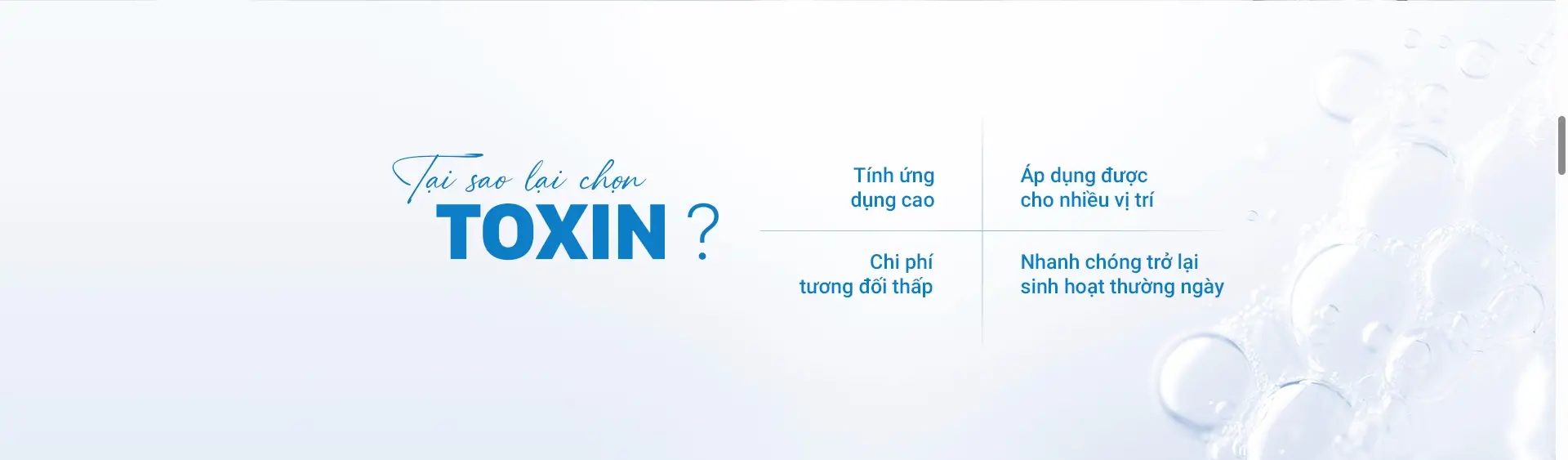 Đây là liệu pháp có thành phần chính là Clostridium botulinum Toxin, giúp giảm sử dụng cơ trong một thời gian nhất định, cải thiện các nếp nhăn trên mặt do cơ biểu cảm, đồng thời có thể mang lại hiệu quả giảm kích thước các cơ lớn như cơ cằm vuông, cơ thang và cơ bắp chân. Ngoài ra, Nó còn giúp giảm lượng mồ hôi tiết ra ở những vùng cơ thể tiết mồ hôi quá mức, có hiệu quả trong việc cải thiện chứng ra mồ hôi nhiều.
