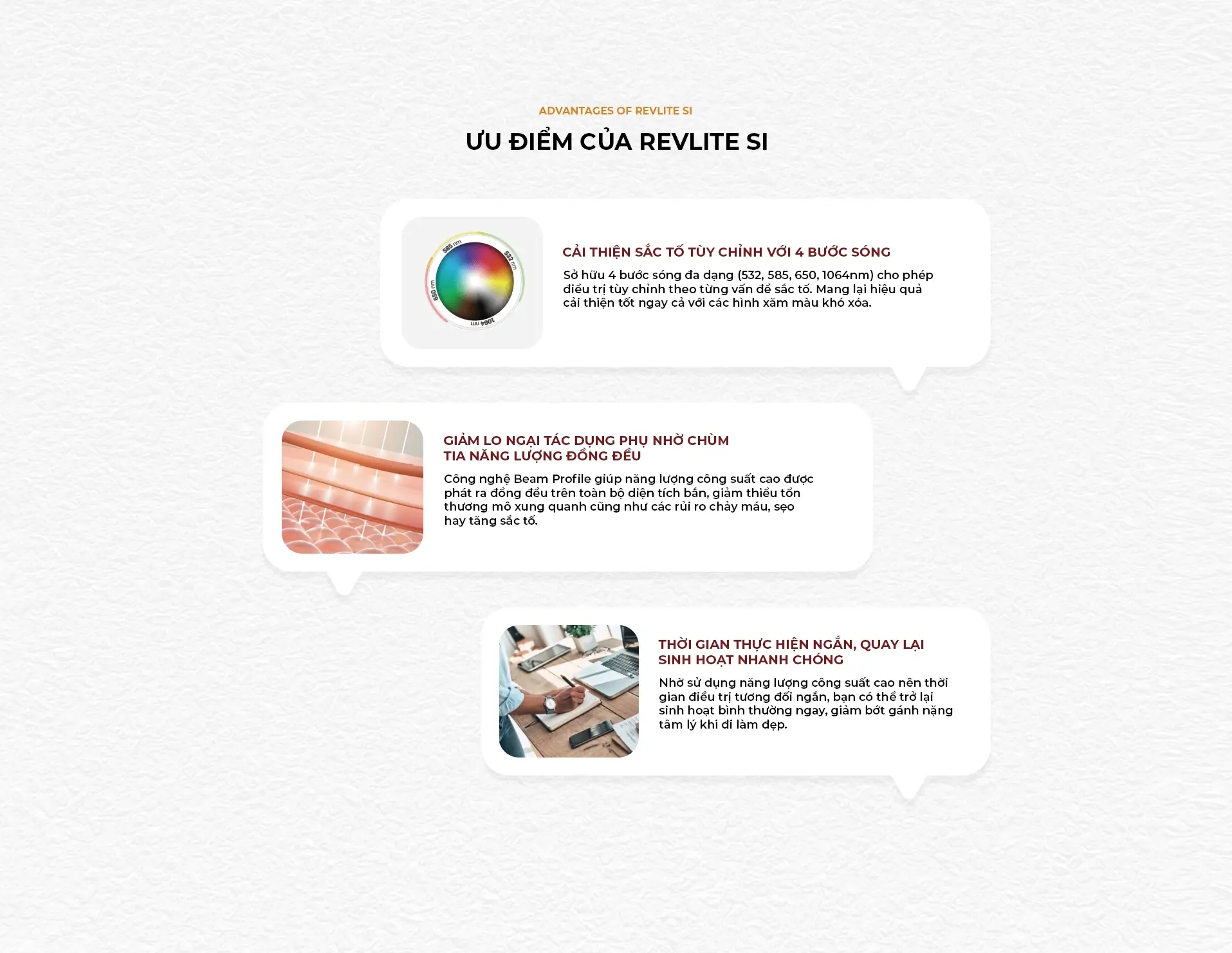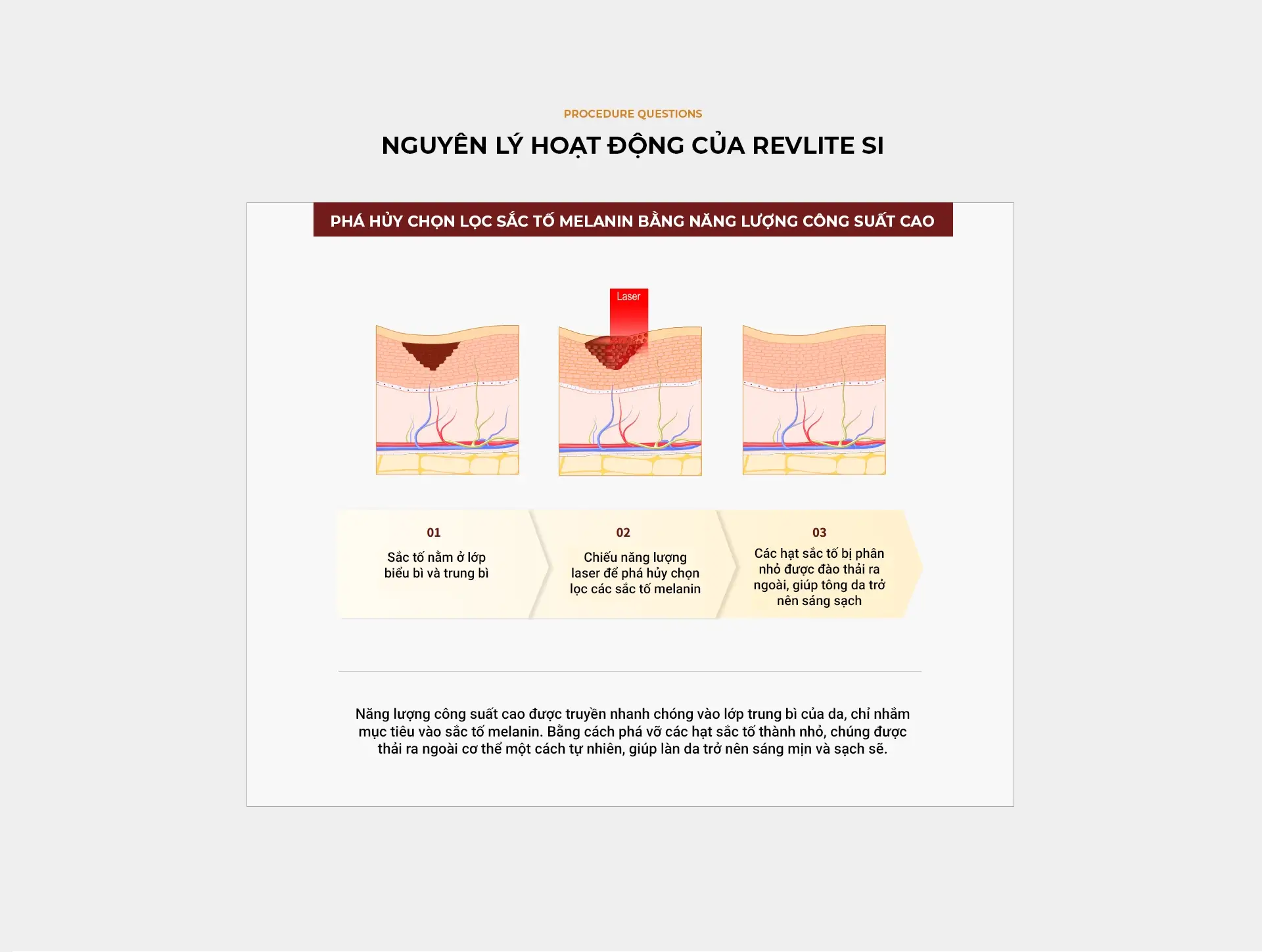 Revlite SI phát ra năng lượng cao trong thời gian ngắn một cách tức thì, nhắm chọn lọc vào sắc tố melanin tồn tại ở biểu bì và hạ bì của da, phân hủy các hạt sắc tố thành mảnh nhỏ để cơ thể tự nhiên hấp thụ và loại bỏ, nhờ đó mang lại làn da sáng và sạch sẽ.