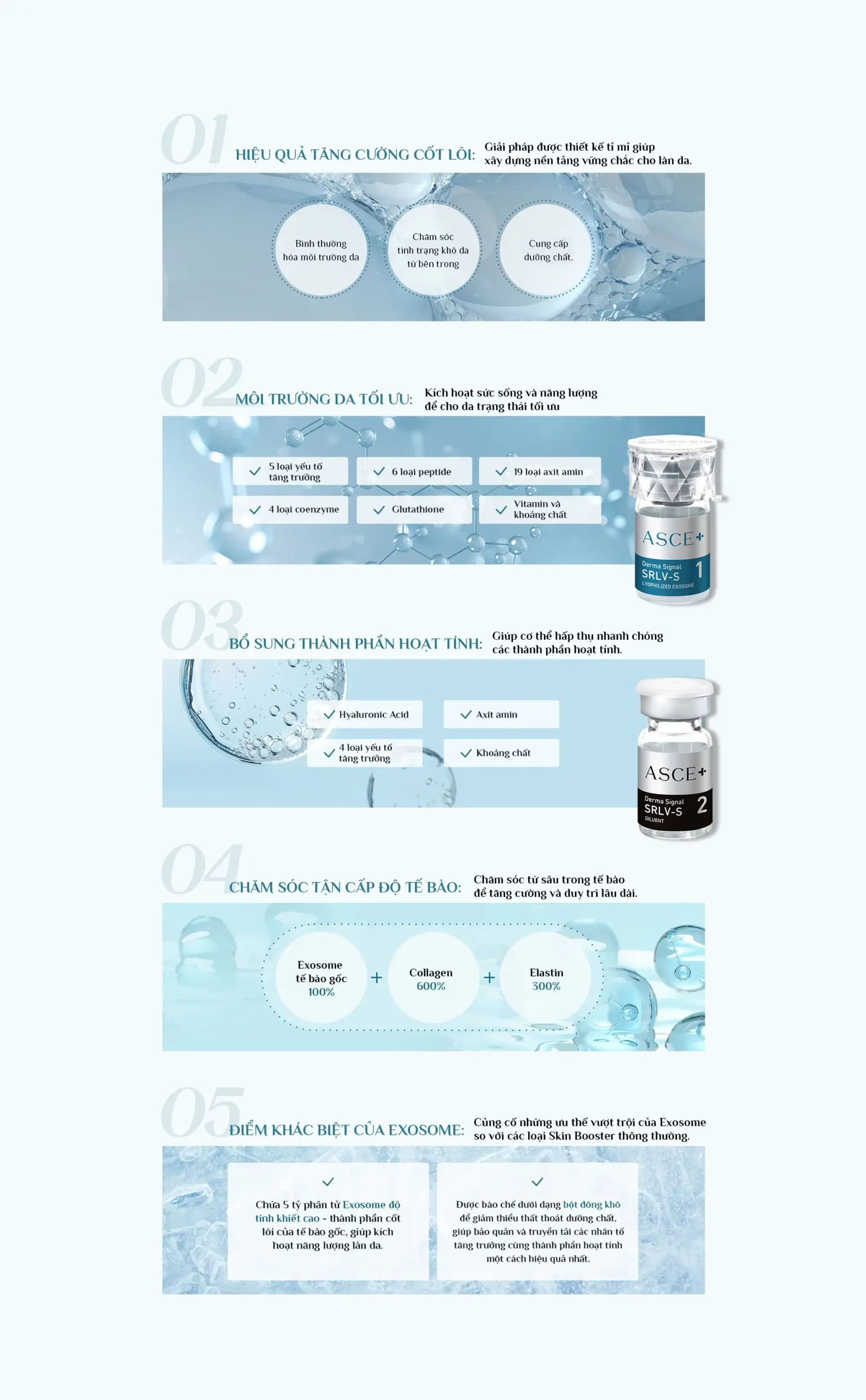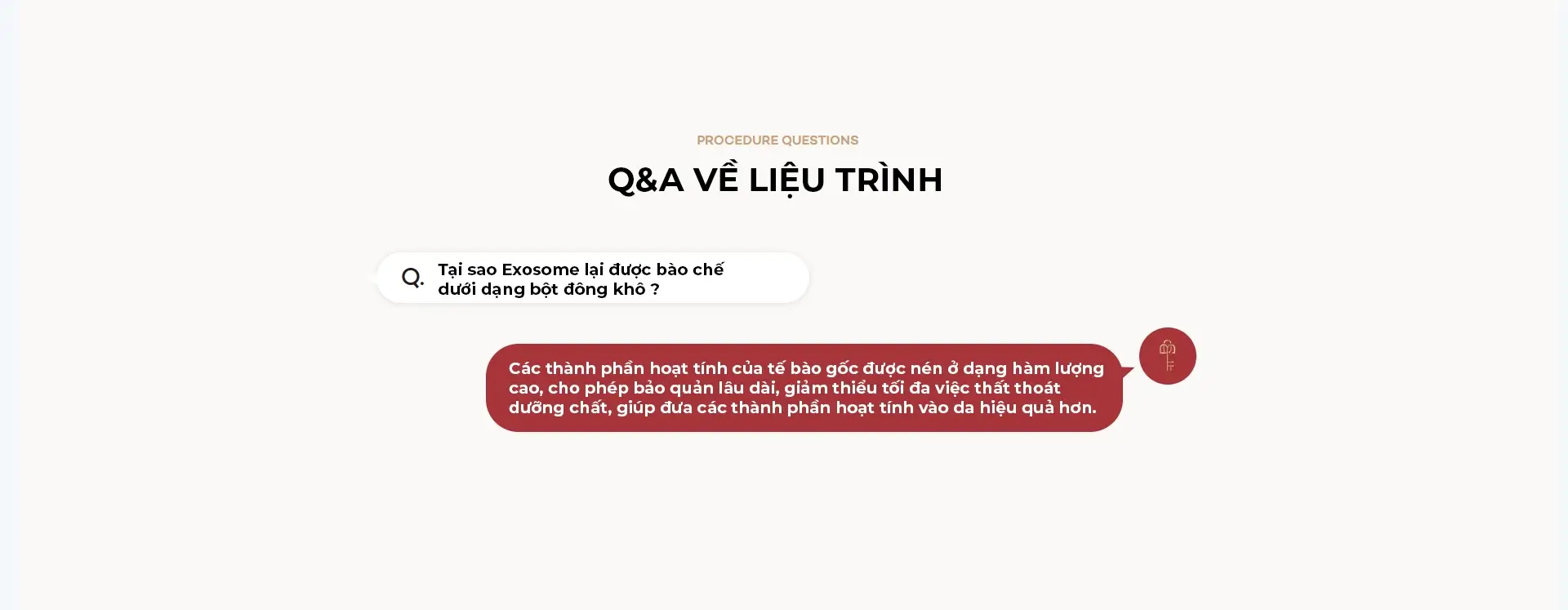 Exosome là tinh thể chứa các thành phần cốt lõi của tế bào gốc. Được phân tách và tinh chế ở độ khiết cao từ môi trường nuôi cấy tế bào gốc, đây là loại Skin Booster giúp chăm sóc hiệu quả làn da bị tổn thương và thúc đẩy kích hoạt năng lượng tự nhiên của da. Sản phẩm thông qua nhiều thành phần như 5 loại yếu tố tăng trưởng, 6 loại peptide, 19 loại axit amin, 4 loại coenzyme, vitamin và khoáng chất, glutathione và nhiều thành phần hoạt tính khác, có thể giúp tái tạo da và cung cấp dinh dưỡng.